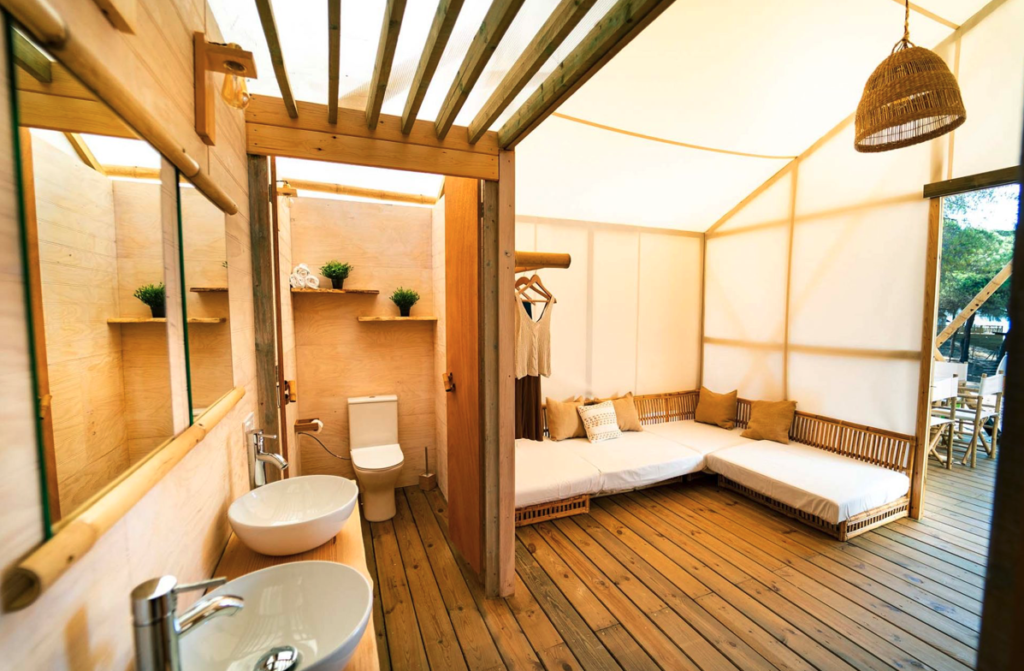 La Tienda Bali destaca por su sensación de amplitud y confort. Su diseño permite disfrutar de una estancia relajada, perfecta para parejas o familias que desean vivir el camping de una forma diferente, combinando naturaleza y bienestar.